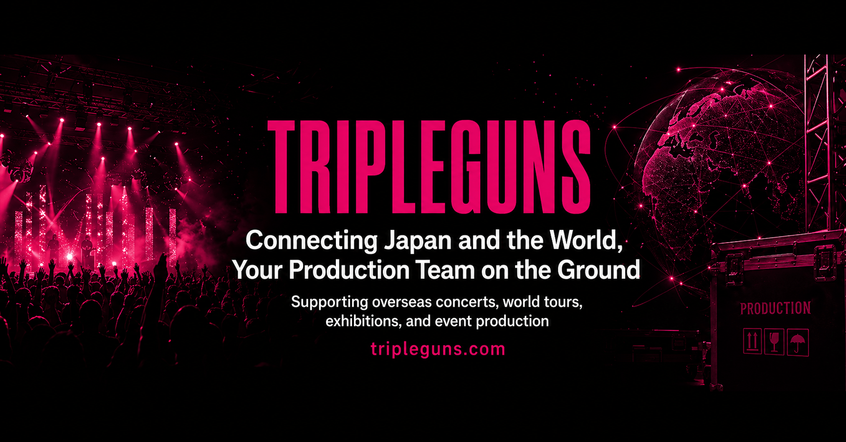 Tripleguns is an international live production company connecting Japan and the world. We support overseas concerts and world tours for Japanese artists, including local production management, venue coordination, and stage production.
